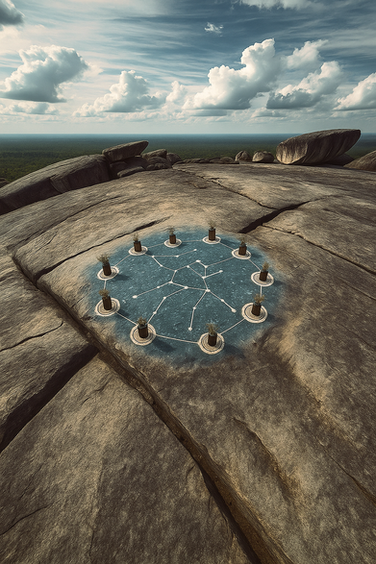 Utilizando o aplicativo Stellarium, foi mapeado o céu noturno da região em uma data específica (latitude -23.1414, longitude -46.5506), e escolhida a constelação de Perseu para ser projetada sobre a superfície da pedra. Cada estrela é representada por vasos com plantas nativas — como o cabelo-de-índio — que também funcionam como suporte para QR codes com informações astronômicas e ambientais. As linhas da constelação serão traçadas com pigmentos naturais ou tintas temporárias, evocando a estética das pinturas rupestres.
